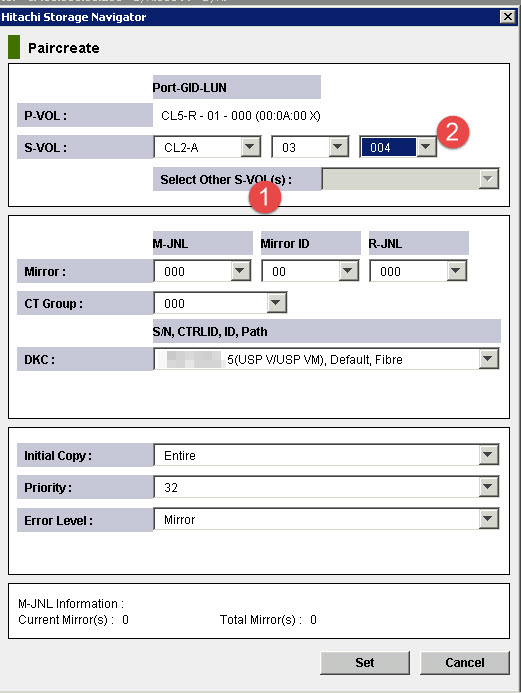 4. Now it's time to specify our destination. Again the destination is in the same format so check your destination first to identify the host_grp number and lun number for the S-VOL. Here is the image from our setup. Number 1 represents the destination Host_Grp and number 2 represents the lun number (position) in that host_grp.As mentioned, select the S-VOL. First group is Port (CL2-A) in our case, second is the hostgroup and the third group is lun number. Next, specify the Master Journal M-JNL (journal group on primary array where journal volumes are) and remote journal R-JNL (journal group on secondary array where the journal volumes are). Consistency group is important (CG Group) if you have multiple luns that have to be in a consistency group, make sure all of them share the same CT Group.pcv3