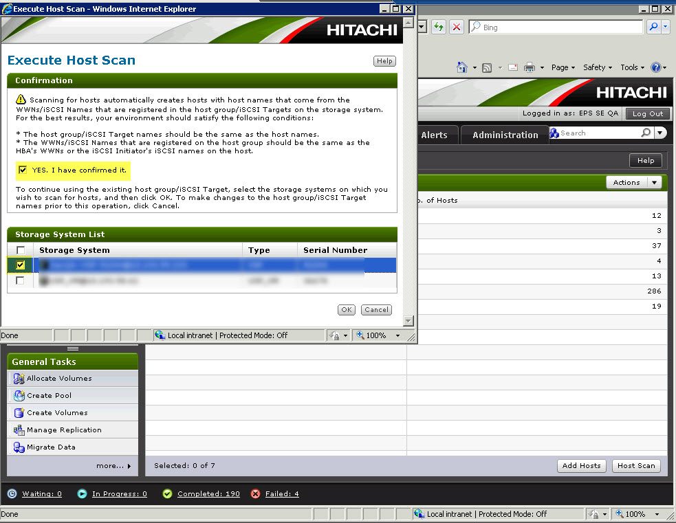 Syncronization is a bit tricky as Device Manager thinks that one group in Storage Navigator (Element Manager) represents a host but sometimes admins will put all the WWN's for a cluster under a name. As a result when Host Scan is complete, all those WWN will be part of one host rather then multiple.