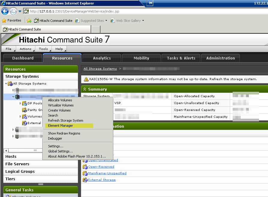 Anyway, first you will need to open storage navigator. You could either open SVP directly or login to HCS, right click on the source array and select Element Manager (please note if you see the message: "HTTP Status 404 - The requested resouce () is not available" after you click i trust the certificate, just close the Hitachi Storage Navigator window - titled Apache Tomcat/6.0.16 and try again)